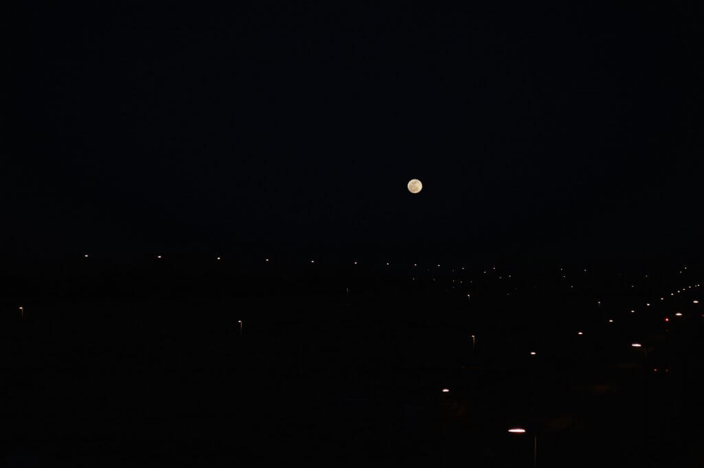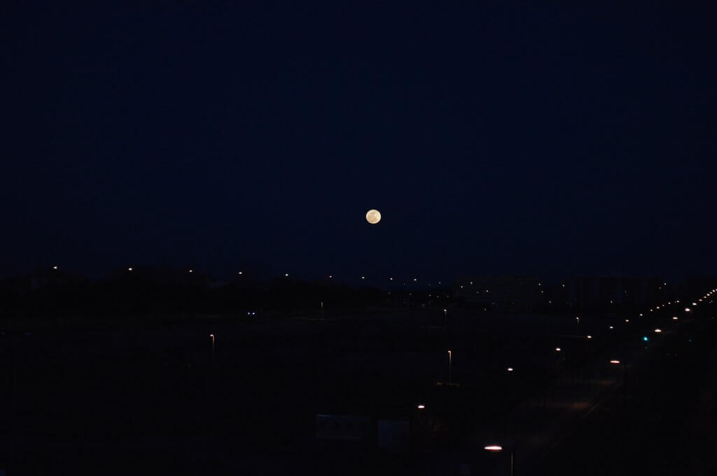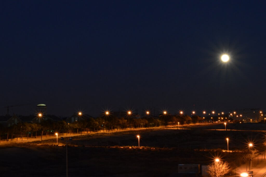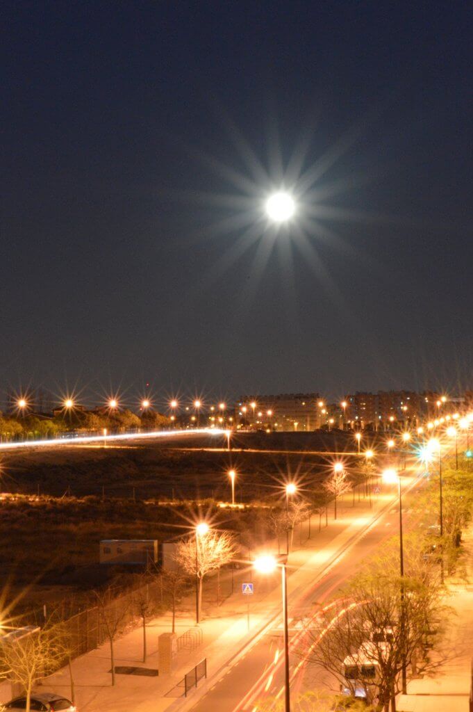 Y esto es lo que salió… un montón de destellitos por todas partes, haces de luz y un par de lunas más o menos distinguibles. Todo con el trípode, por supuesto, que el tiempo de exposición de alguna de las fotos era de 30 segundos a un minuto y el pulso no es una de mis mejores cualidades.
