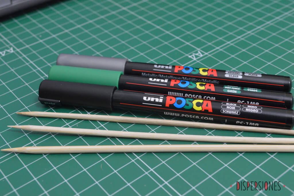 Uni Posca verde, negro y plateado. Brochetas de madera para sujetar las bolas mientras se pintan.
