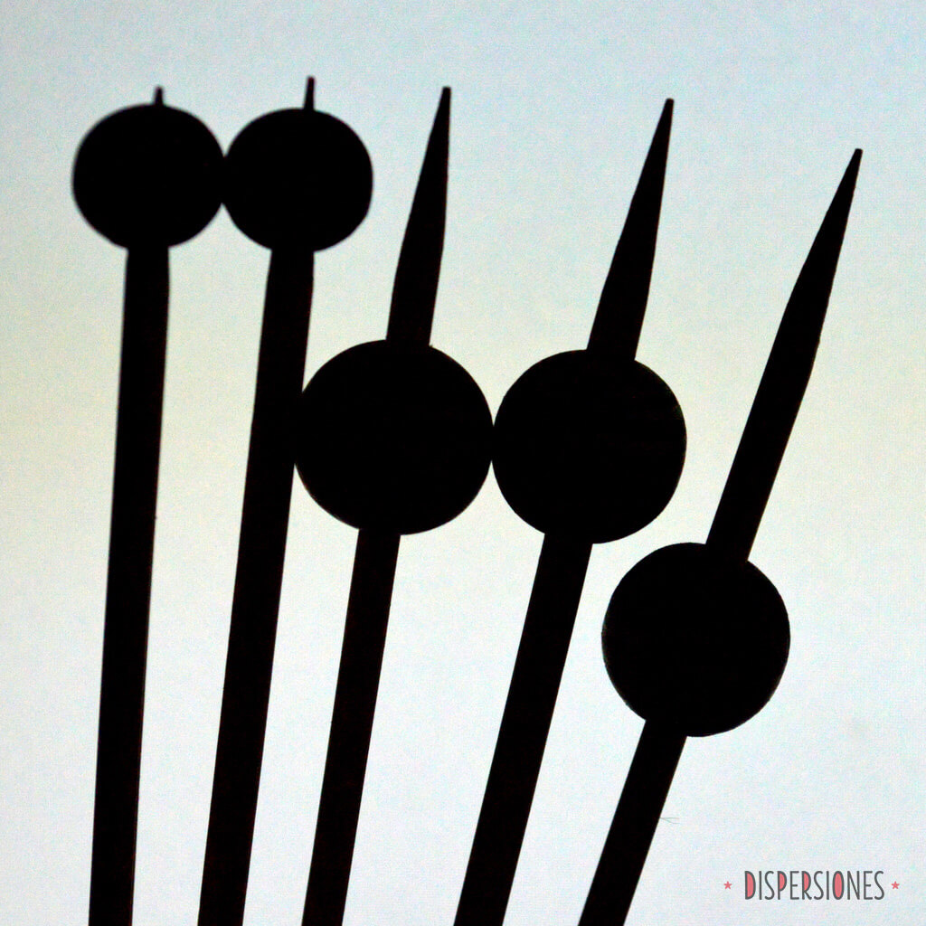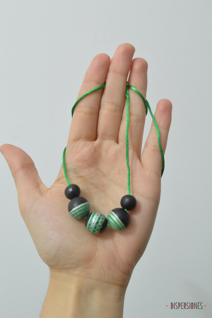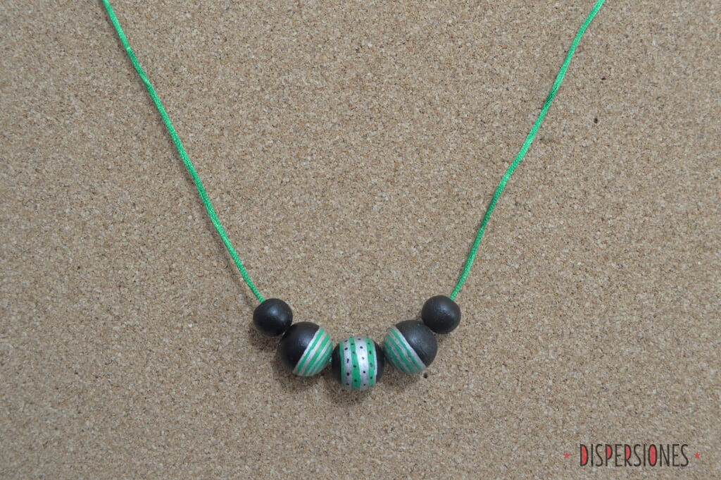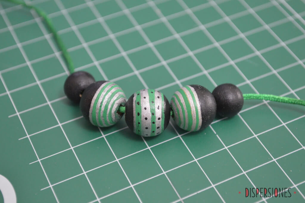 Para sujetarlas mientras pintaba, utilicé brochetillas de madera. Las rayas de las cuentas están hechas usando las brochetas a modo de torno… ahora pienso que fue divertido, pero hubo presión porque parecía que en cualquier momento se me iba a ir la mano y a hacer un desaguisado. Misteriosamente, no me pasó en las bolas difíciles (las de las rayas finas) pero la central… ay la central…