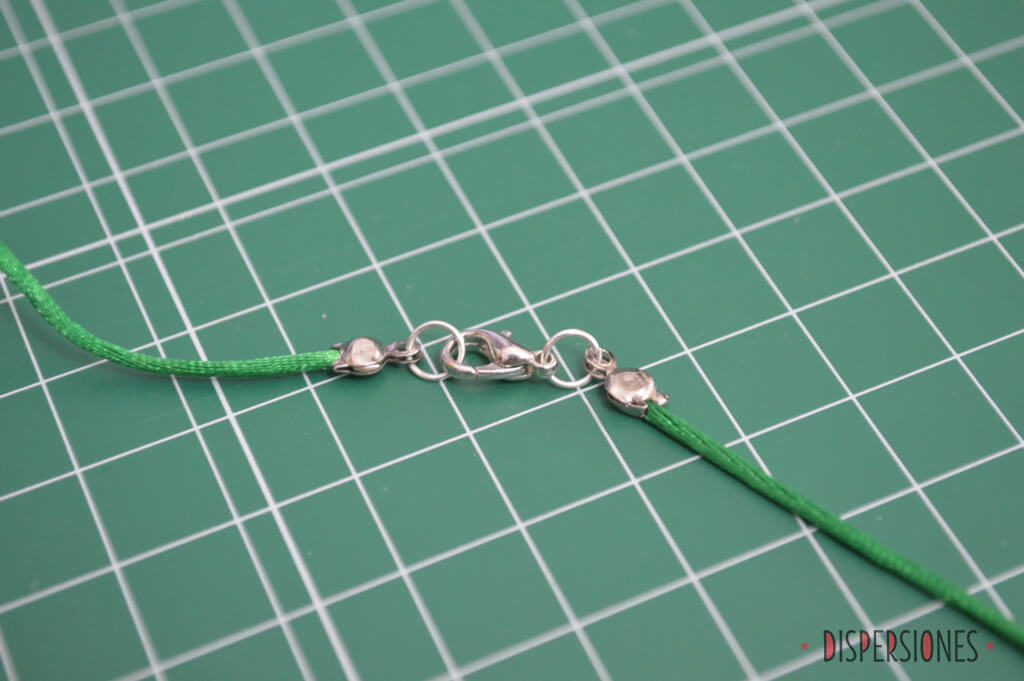 Como los más avispados habréis visto, el cordón final no es el mismo que el de las fotos iniciales. Bien visto. El primero era mi idea inicial (el algodón encerado) pero tuve un pequeño fallo de cálculo con el tamaño de los tapanudos. El 1.5mm del cordón de algodón no cabían en el 1.5mm del tapanudos, así que al final cogí cola de ratón de 1mm que tenía de cuando el kumihimo, y acabé haciéndolo con eso. No es lo mejor, pero es lo que hay. Al ser más maleable parece que está un poco arrugadico y eso con el algodón no habría pasado por su rigidez, pero para otra vez ya me lo aprendo.
