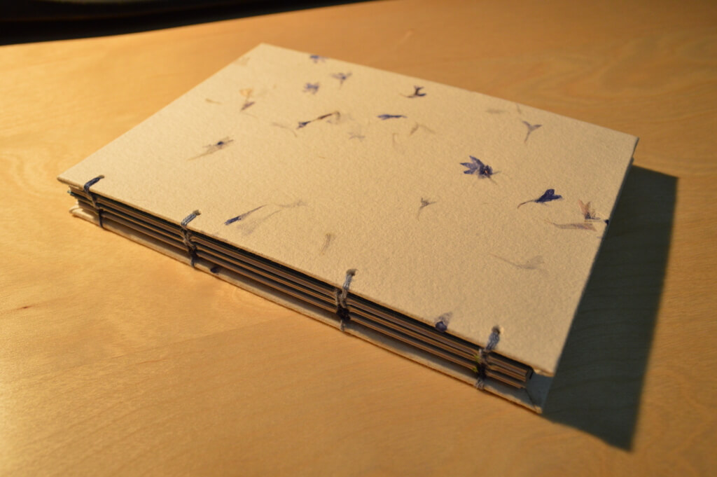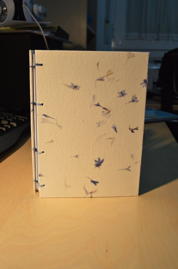 Las tapas están forradas con papel artesano de algodón de Piedra Papel y Tijeras. Lleva incorporadas pequeñas florecillas naturales de color azul.